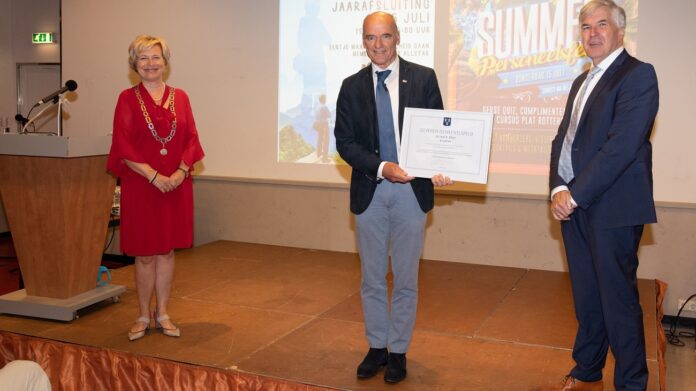 PAPENDRECHT – Rector/bestuurder van De Lage Waard, Kees Kloet, heeft donderdag als blijk van waardering en erkentelijkheid de zilveren gemeentespeld ontvangen. Tijdens zijn afscheidsreceptie overhandigden waarnemend burgemeester Annemiek Jetten en wethouder Kees de Ruijter ook de bijbehorende oorkonde. Kloet werd op 1 januari 2017 aangesteld als directeur onderwijs/bestuurder van De Lage Waard, met als opdracht zorg te dragen voor de dagelijkse leiding van de school en de leiding van de organisatieontwikkeling.
