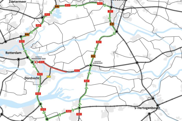 De A15 richting Gorinchem is dan afgesloten tussen knooppunt Ridderkerk-Zuid en oprit (25) Sliedrecht-Oost.
