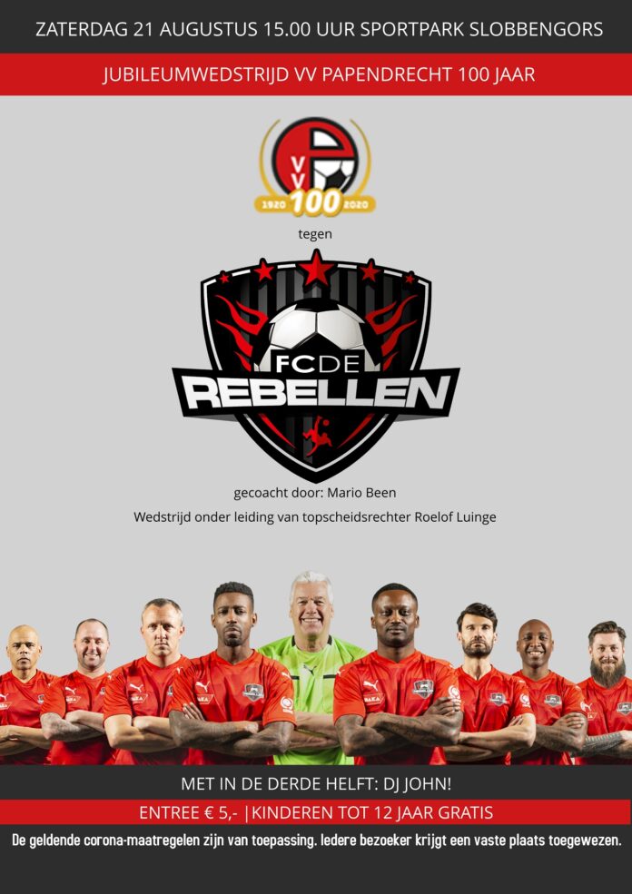PAPENDRECHT – Iets meer dan een jaar geleden vierde VV Papendrecht haar 100-jarig bestaan volgens de toen geldende coronamaatregelen. We zijn nog steeds niet van COVID-19 af, maar wel wordt een nieuwe, grote jubileumactiviteit georganiseerd. Op 21 augustus zal een spektakelvolle jubileumwedstrijd plaatsvinden op sportpark Slobbengors. Een combinatieteam van huidige eerste-elftalspelers en legendes uit het roemrijke verleden van de club zullen het opnemen tegen FC de Rebellen. Die ploeg bestaat uit oud-eredivisiespelers en culthelden. De wedstrijd wordt georganiseerd onder de huidige coronarichtlijnen. Dit betekent een vaste zitplaats voor de toeschouwers en anderhalve meter afstand houden.