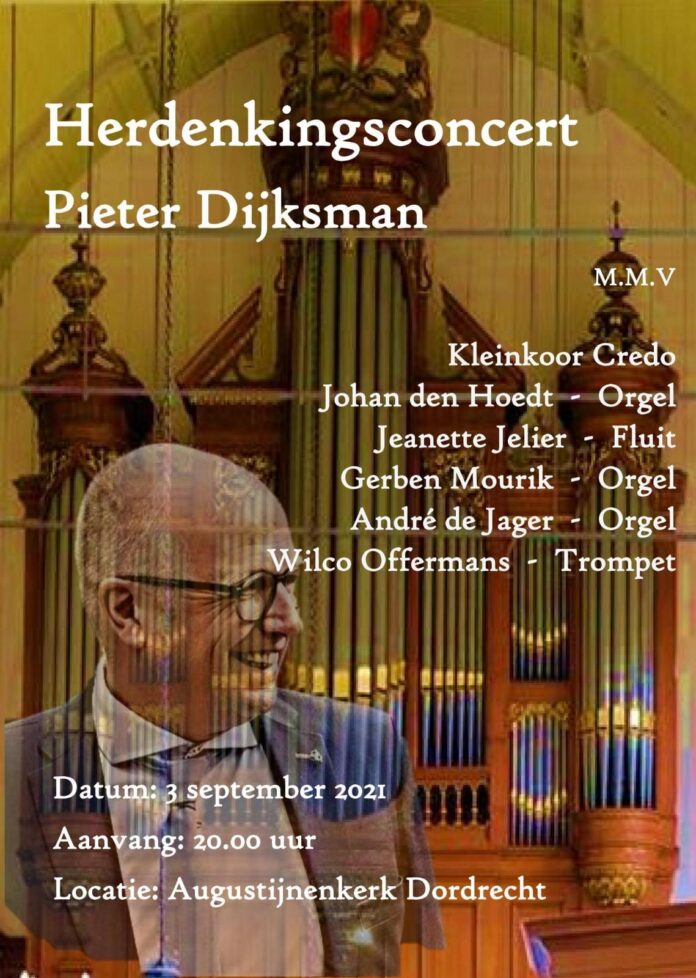 Zowel in de hoedanigheid van organist als die van dirigent was Pieter een graag geziene gast in de Augustijnenkerk, en toen vorig jaar vanwege de Corona pandemie de orgelconcerten niet door konden gaan maakte hij videoregistraties van een tiental concerten die nog steeds op YouTube terug te zien zijn. Dit was voor de Stichting Behoud Augustijnenkerk aanleiding om in samenwerking met organist Johan den Hoedt, een persoonlijke vriend van Pieter, een herdenkingsconcert te organiseren, waaraan organisten Gerben Mourik, Johan den Hoedt en André de Jager, fluitiste Jeanette Jelier-den Hoedt, trompettist Wilco Offermans en het Vocaal ensemble “Credo” hun medewerking zullen verlenen.