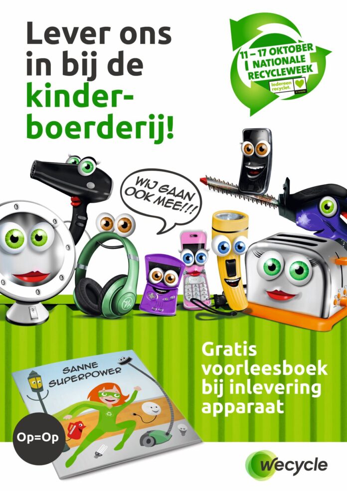 PAPENDRECHT – Kinderboerderij Papenhoeve in Papendrecht helpt bezoekers beter recyclen, zij zijn een Wecycle-inleverpunt voor kleine apparaten. Tijdens de Nationale Recycleweek (11 – 17 oktober) ligt hier voor snelle inleveraars van een klein apparaat een leuk cadeautje klaar, een gratis voorleesboekje: Sanne SuperPower. Op een leuke manier leren kinderen en hun (groot) ouders alles over recyclen. Wees er snel bij, op=op!