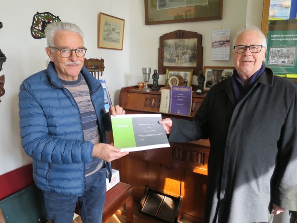 Foto: Kok Gorlitz (links), Penningmeester van Knotgroep De Wilg overhandigt de cheque aan Hugo Spek, penningmeester van Dorpsbehoud.