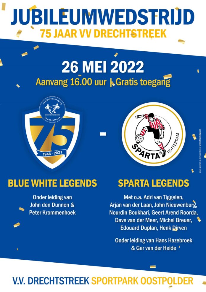 PAPENDRECHT – Op donderdag 26 mei (Hemelvaartsdag) speelt een team van oud-Drechtstreekspelers een bijzondere jubileumwedstrijd tegen een team van oud-spelers van Sparta Rotterdam. Dit treffen vindt plaats in het kader van het 75-jarig jubileum van de voetbalvereniging. Vanwege het originele karakter van de wedstrijd is het RTV sportprogramma Drechtsport live aanwezig om verslag te doen. De uitzending op Papendrecht FM duurt donderdag van 15.00 tot 18.00 uur.