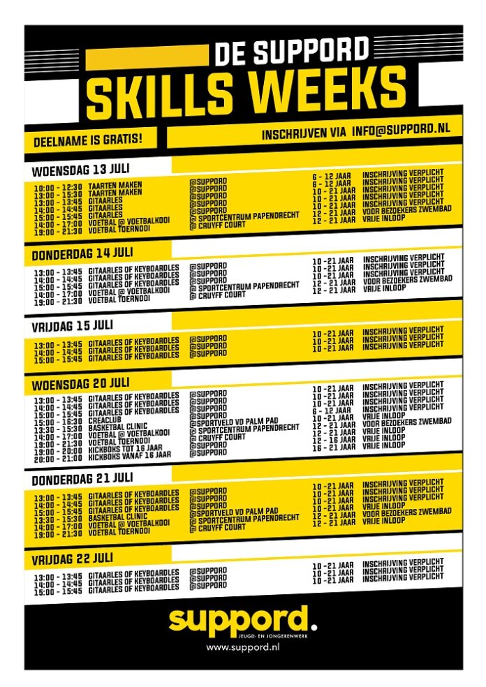 PAPENDRECHT – Het jeugd- en jongerenwerk van Suppord organiseert de eerste 2 weken van de zomervakantie weer de Suppord Skillsweeks. Een programma vol activiteiten voor jongeren tussen de 8 en 21 jaar.