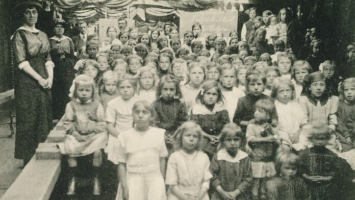 Foto: Schoolkinderen in een tijdelijke school te Papendrecht, in het ruim van een schip.