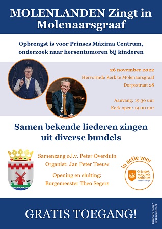 De avond in Molenaarsgraaf wordt geopend en gesloten door de burgemeester Theo Segers, die ook een aantal liederen zal dirigeren. Het orgel wordt bespeeld door Jan Peter Teeuw en Peter Overduin presenteert en dirigeert de avond. Iedereen is van harte welkom om mee te komen zingen. De opbrengst van deze avond is voor het Prinses Maximá Centrum.