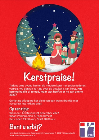 PAPENDRECHT – Op Kerstavond 24 december organiseert Vrije Baptisten Gemeente Papendrecht een Kerstpraise. De jeugdband van de VBG verzorgt de muziek: veel kerstliederen en enkele praiseliederen.