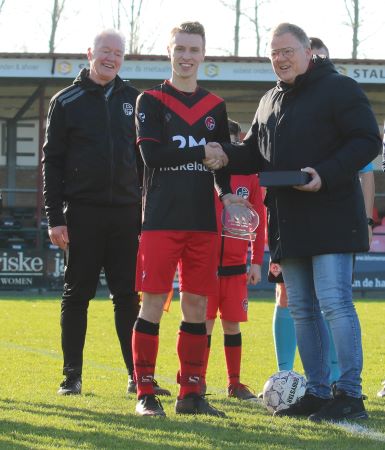 PAPENDRECHT – Op zaterdagmiddag 28 januari kwam Jarden van Ek voor de 100e keer in actie voor het eerste elftal van Voetbalvereniging Papendrecht. Hij ontving uit handen van voorzitter Hans Jonker een fraaie herinnering aan deze mijlpaal.