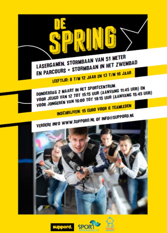 PAPENDRECHT – Sportcentrum Papendrecht, Wasko & Suppord komen met iets nieuws, namelijk de Spring. Bij De Spring gaat het om een driekamp. Deze bestaat uit een stormbaan in de sporthal, een lasergame in de sporthal en een parcours in het zwembad (alleen voor de 8-12 jarigen).