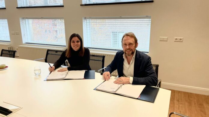 Monica Siebes (l) en Rogier Vegter (r) tijdens het officiële tekenmoment