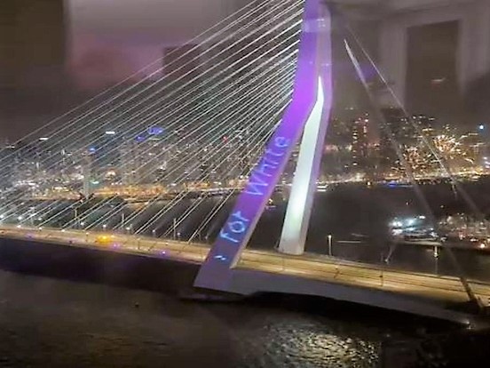 REGIO – De politie heeft twee mannen aangehouden voor het projecteren van beledigende, neonazistische en discriminerende teksten op de pyloon van de Erasmusbrug. In de eerste tellen van dit jaar waren minutenlang met laserlicht geschreven leuzen te zien als ‘Vrolijk blank 2023’ en ‘White Lives Matter’. De verdachten zijn een 24-jarige man uit Zwijndrecht en een man van 34 uit het Limburgse Landgraaf. De politie houdt rekening met nog meer arrestaties.