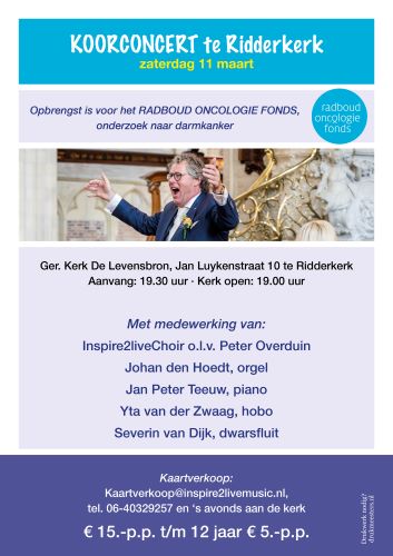 RIDDERKERK/REGIO – Op zaterdag 11 maart organiseert de Gereformeerde Kerk De Levensbron een koorconcert ten behoeve van onderzoek naar darmkanker. Het bekende koor Inspire2LiveChoir zal optreden aan de Jan Luykenstraat 10 te Ridderkerk.