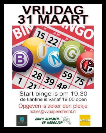 De kantine gaat open om 19:00 uur. De bingo begint om 19:30 uur. Wil je verzekerd zijn van een plekje, geef je dan snel op via acties@vvpapendrecht.nl. Vol is Vol.