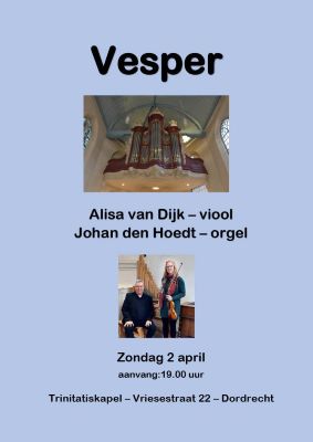 De muziekvesper vindt plaats in een historische omgeving, namelijk de Trinitatiskapel van Dordrecht. Laat je meeslepen door de sfeer van deze oude Kapel, terwijl je geniet van de instrumentale klanken.
