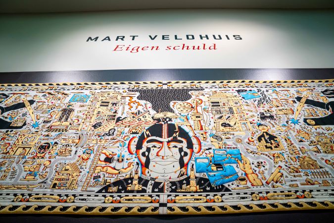 DORDRECHT – Een vuist maken tegen het leenstelsel. Dat is wat illustrator Mart Veldhuis voor ogen had bij het maken van zijn indrukwekkende wandtapijt Eigen schuld. Hij geeft hierop uitdrukking aan de stress, druk en andere ongemakken die ontstaan bij een studieschuld. Op het bijna vijf meter brede wandtapijt is te zien hoe het leven van een student met schulden er uitziet. Het Dordrechts Museum toont het vanaf 6 april aan haar bezoekers.