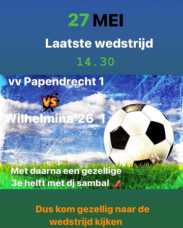 PAPENDRECHT – Op zaterdag 27 mei speelt de hoofdmacht van Voetbalvereniging Papendrecht op het eigen sportcomplex de laatste competitiewedstrijd van het seizoen 2022-2023 tegen Wilhelmina’26. De wedstrijd start om 14.30 uur.