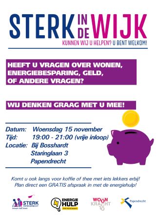 Tijdens de inloopavond zijn diverse organisaties aanwezig zoals Sterk Papendrecht, de Energiehulp, Woonkracht 10 en de medewerker IDO.