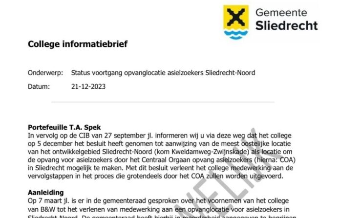 REGIO – De gemeente Sliedrecht heeft onder meer de gemeente Papendrecht benaderd om meer samen te werken bij de opvang van asielzoekers. Dit meldt online krant Sliedrecht24, die de beschikking heeft gekregen over een vertrouwelijke College Informatiebrief (CIB) van de Sliedrechtse wethouder Ton Spek aan de Sliedrechtse gemeenteraad over de locatie van een te bouwen asielzoekerscentrum (azc) dat plaats moet bieden aan 250 personen.