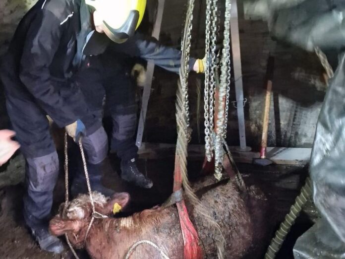 Hoewel de brandweer een professionele ‘veekraan’ had meegebracht, verliep de reddingsoperatie niet zonder hindernissen. Het kostte uren voordat de kraan op de juiste manier kon worden ingezet. Toen de kraan eenmaal in stelling was, kon de brandweer het kalf binnen enkele minuten uit de put redden.