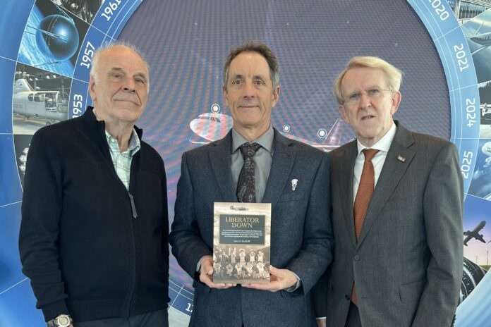 PAPENDRECHT – Vrijdagmiddagmiddag 8 maart om 16.30 uur, vrijwel op de minuut 80 jaar nadat zijn vader boven Papendrecht uit zijn Liberator bommenwerper moest springen, kreeg Jim Keeffe uit handen van Wim de Leur en Adri Brevet het boek Liberator Down overhandigd.