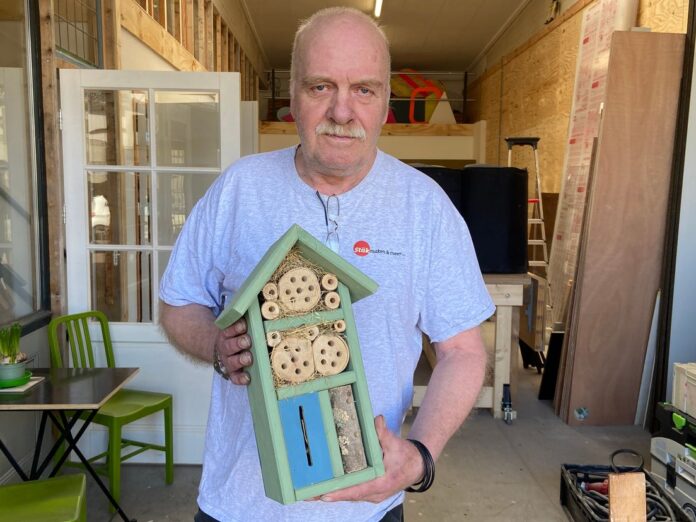 DORDRECHT – De rekensom is gemaakt: Henk van Kints boorde al minstens 10.000 gaten in planken, stronken en stammen. Allemaal om van een waardeloos stuk hout een mooi insectenhotel te maken. In een splinternieuwe werkplaats in Dordrecht transformeren Henk en zijn collega’s afval tot waardevolle spullen.