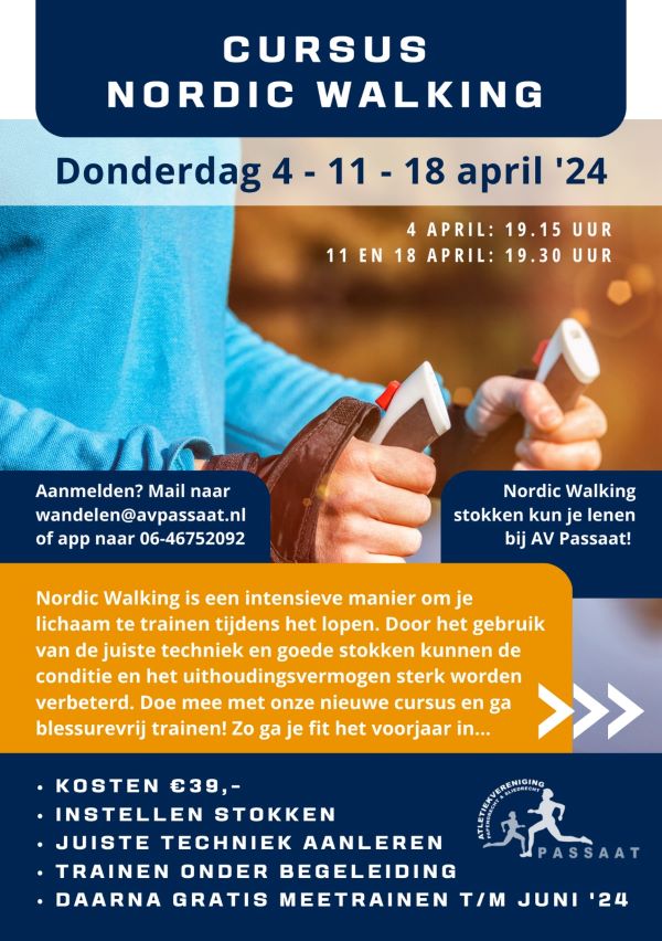 De 2 volgende cursusavonden zijn op donderdag 11 en 18 april om 19.30 uur. De kosten voor deze cursus zijn € 39 en daarna mag er tot en met juni 2024 gratis worden mee getraind met de Nordic Walkinggroep op vrijdagavonden om 19.00 uur.