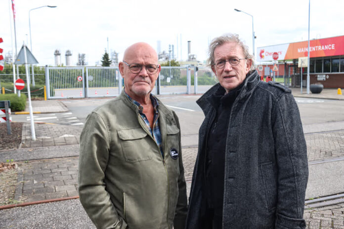 Kees van der Hel (l) en Joop Keesmaat (r) voor de poort van Chemours, foto: Corrado Francke