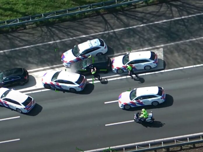 Bij Amsterdam wordt de automobilist uiteindelijk klemgereden door zeven politieauto’s. Direct trekken drie agenten de man uit zijn auto en drukken hem tegen de grond.