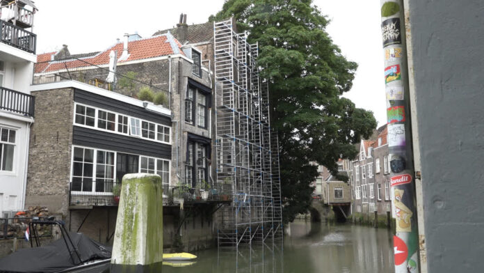Er zijn steigers geplaatst bij het monumentale pand aan de Grotekerksbuurt 16 in Dordrecht.