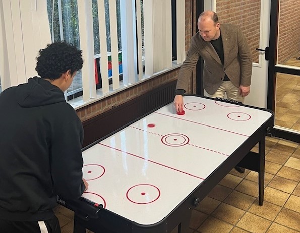 Na een korte rondleiding door het pand en een kennismaking met het leven van de groep jongeren op deze locatie, werd het Air-Hockey met hen getest. Het vergt enige oefening om het doel te bereiken, een mooie parallel met de dagelijkse opgave van deze jongeren die door de gemeente Papendrecht hierbij actief worden ondersteund.