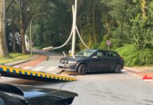 Een auto is donderdagochtend tegen een lantaarnpaal gebotst in Zwijndrecht, die daardoor doormidden is gebroken. Verder heeft...