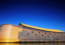 De grote houten replica van de ark van Noach staat te koop. Sinds 2012 lag het schip een aantal jaar aan de...